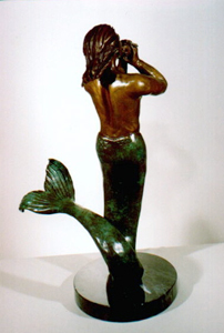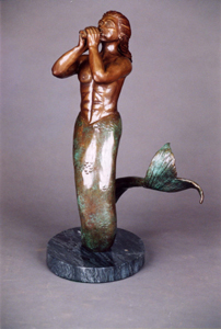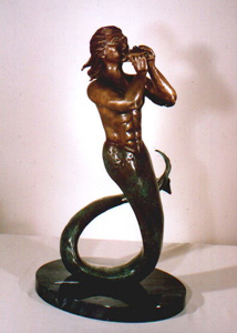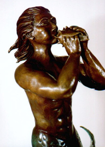 Triton, the son of Poseidon. He is often seen escorting his father and frolicking in the waves with the Mermaids. A god of the seas, Triton blows his conch shell trumpet to raise or calm storms.